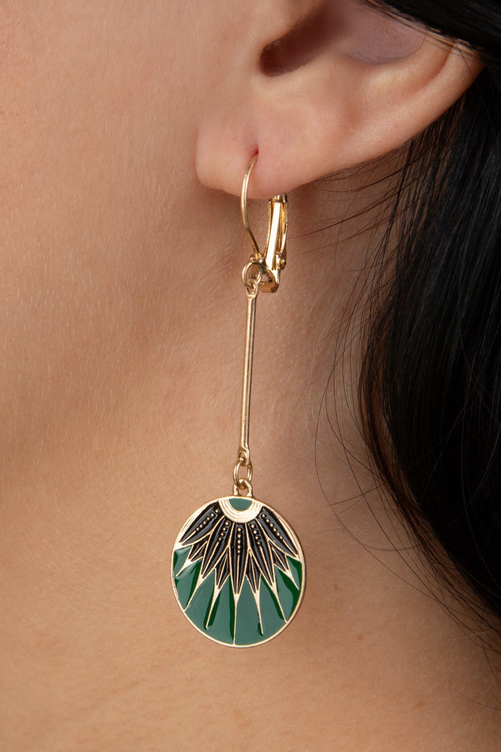Verleihe deinem Outfit einen wahren 20er Jahre Vibe und zeige dich mit diesen Art Deco Disc Ohrringen in Smaragdgrün. Ein langer Ohrring aus antik-goldfarbenem Metall mit einem runden, handbemalten, emaillierten Anhänger in Smaragdgrün, versehen mit blattförmigen Details und einem Hauch Art déco… wow! * Antik-goldfarbenes Metall * Leverback Verschluss * Handbemalte Emaille * Nickelfrei
