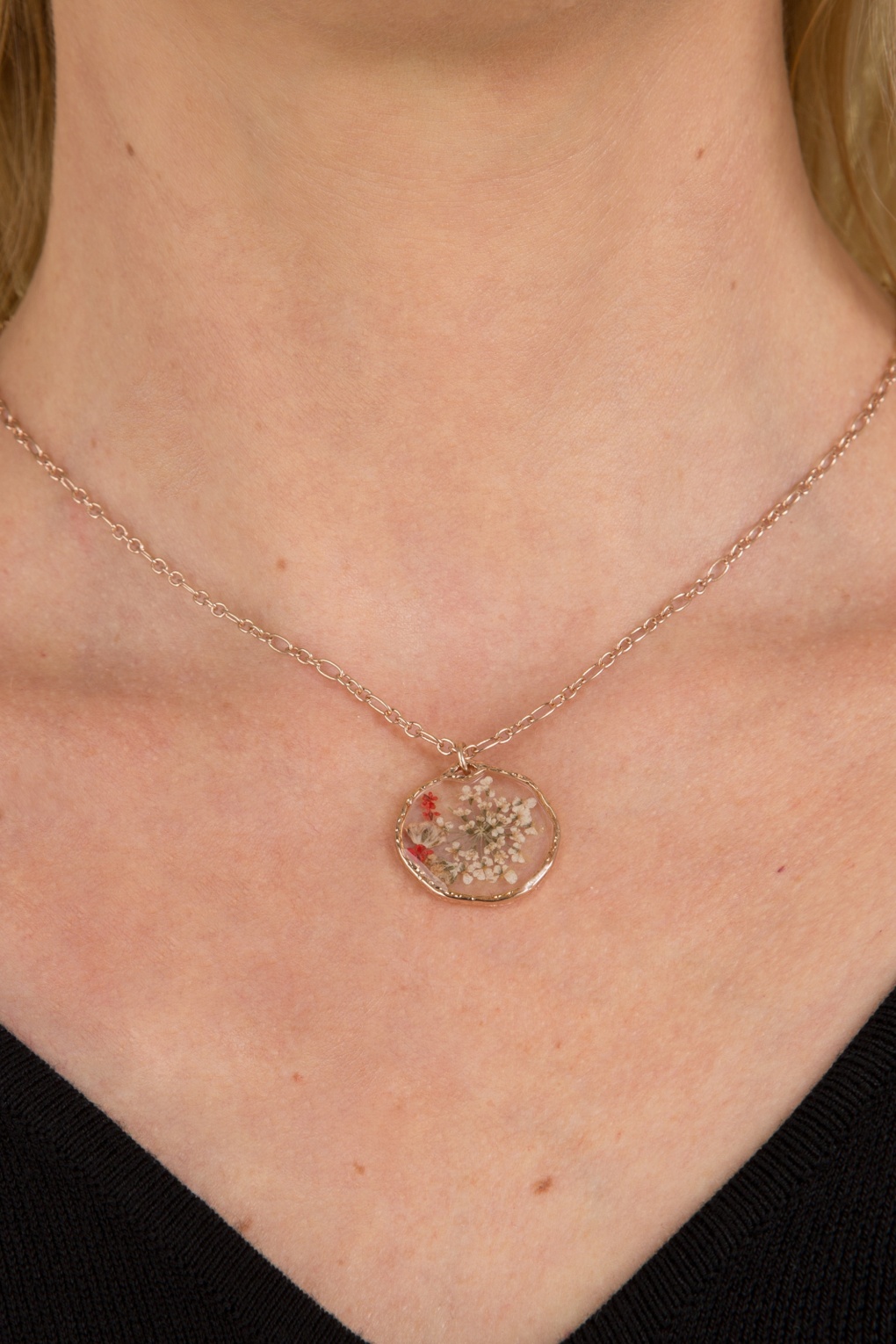 “Bloom baby, bloom!“ Diese wunderschöne Halskette wurde aus goldfarbenem Metall gefertigt und mit einem Anhänger mit echten getrockneten Blumen in einer Harzschicht versehen. * Goldfarbene, verstellbare Halskette * Karabinerverschluss * Harz * Trockenblumen * Nickelfrei/hypoallergen