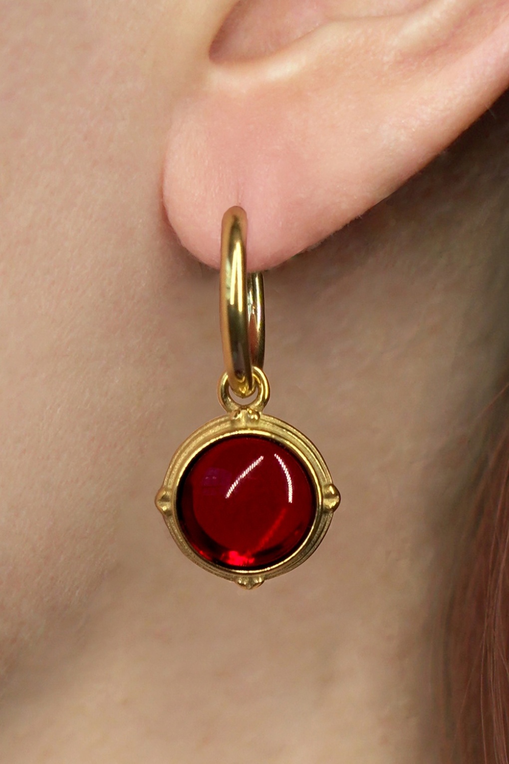 Herzallerliebst & zeitlos! – Diese Ohrringe wurden aus vergoldetem Edelstahl gefertigt und mit einem Anhänger, versehen mit einem rubinroten, kugeligen Glasstein, verziert. * Creolen mit Klickverschluss * Glasanhänger * Vergoldetes Edelstrahl (rostfrei) * Verfärben nicht * Nickelfrei (hypoallergen)