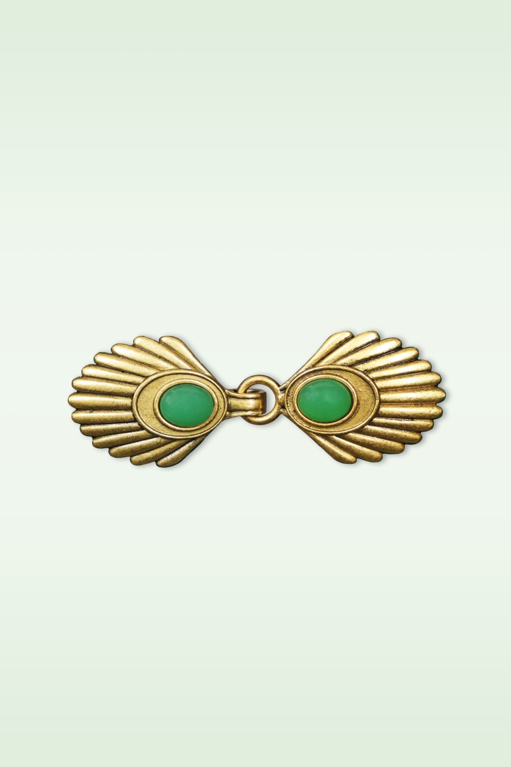Mit diesen praktischen und unglaublich schönen Clips im Art-déco-Stil verleihst du all deinen Cardigans, Jacken und Kimonos ohne Verschluss eine ganz besondere Note. Auch Ponchos, Schals oder Blusen lassen sich damit wunderbar stylen! Das altgoldfarbene Modell aus Messing ist mit smaragdgrünen Glassteinen versehen. * Clips * Verschluss mit Haken und Öse * Messing