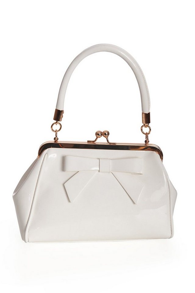 Material: 100% PolyurethanFutter: 100% PolyesterMaße: ca. 27 x 10 x 19 cm- Hauptfach mit Kisslock Verschluss- innen zwei Trennfächer und ein Reißverschlussfach- aussen auf der Rückseite ein weiteres Reißverschlussfach- abnehm- und längenverstellbarer Schultergurt enthalten- Goldfarbener Bügel