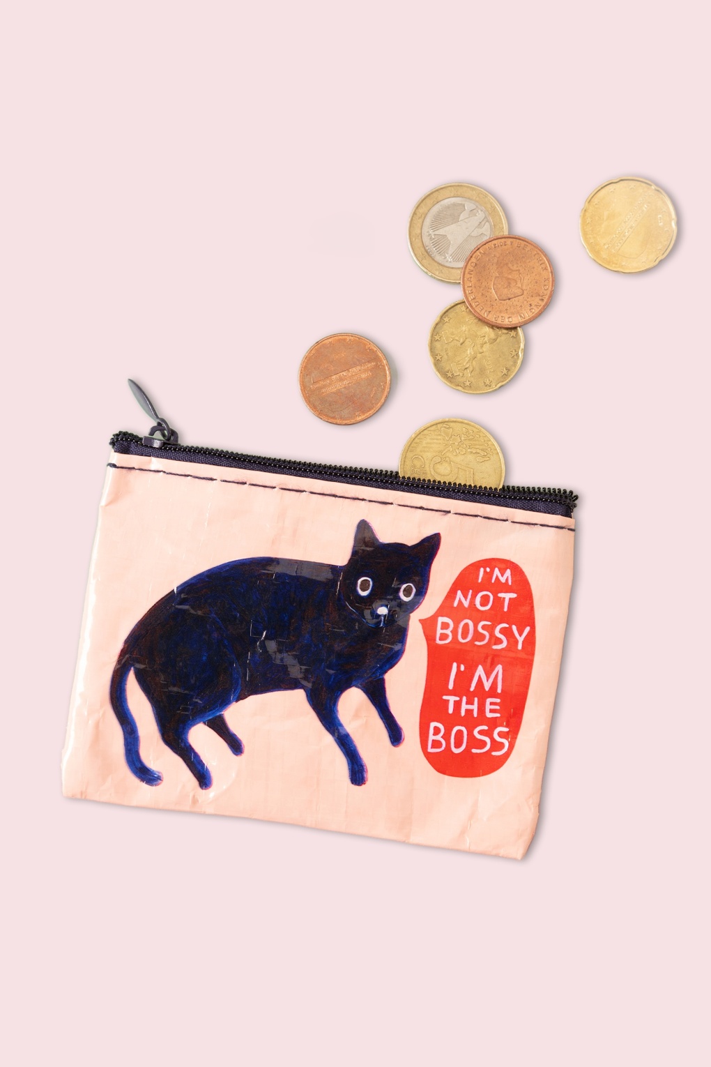 Sei der Boss über dein eigenes Geld! Dieses kleine Portemonnaie wurde zu 95% aus recyceltem Material gefertigt und mit einem faltigen Effekt in Hellrosa versehen. Vollendet mit einem marineblauen Reißverschluss und dem Motiv einer Katze mit dem Text “I’m not bossy, i’m the boss“ * Kleines Portemonnaie * Reißverschluss * Platz für Münzen und einige Karten * Recyceltes Material (95%) * 1% des Ertrags wird gespendet an Umweltorganisationen weltweit