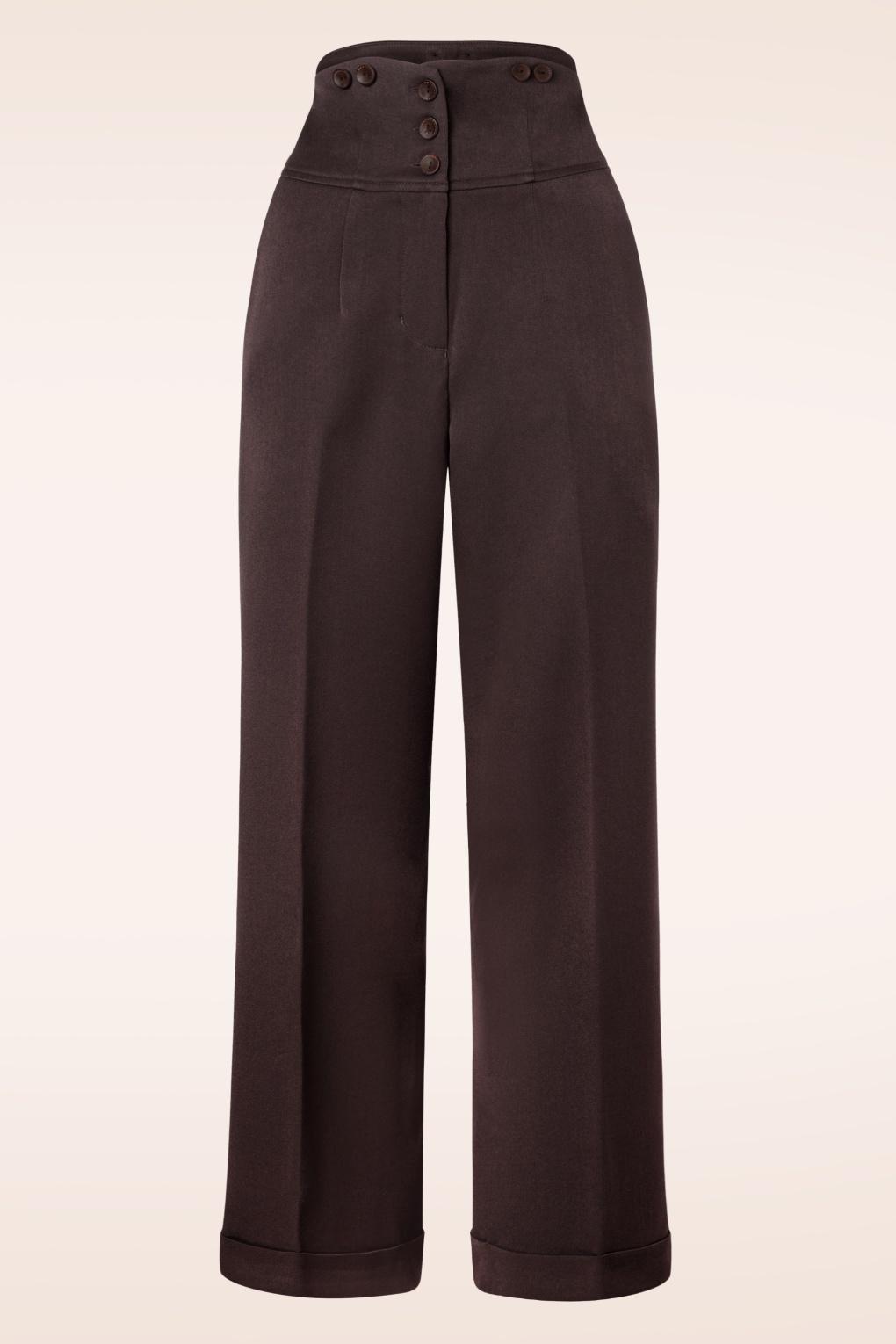 Die 50s Girl Boss Trousers in Brown ist inspiriert an den Hosen die von den selbstbewussten Damen in die 40er und 50er Jahre getragen wurden! Der feminine, hohe Bund kontrastiert schön zu dem weiten Hosenbein und hat einen tollen schlankwirkenden Effekt, auch bei einer breiteren Hüftweite oder einem kräftigen Po. Dank den Knopf-Details kann diese Hose auch mit Trägern getragen werden und das verleiht diese Schönheit eine verspielte Note. Sie ist hergestellt aus einem geschmeidigen, braunen Stoff mit einem sehr geringen Stretch-Anteil und mit einem eleganten Aufschlag am Hosenbein versehen. Trage sie mit einer weißen Bluse und einem Paar Pumps für einen perfekten, retro Büro-Look! * Taillenhoch * Kann mit Trägern kombiniert werden * Seitliche Eingriffstaschen * ‚Blinde‘ Paspeltaschen hinten * Reiß- und Knopfverschluss auf der Vorderseite * Weite Hosenbeine mit Aufschlag * Leicht zu kürzen