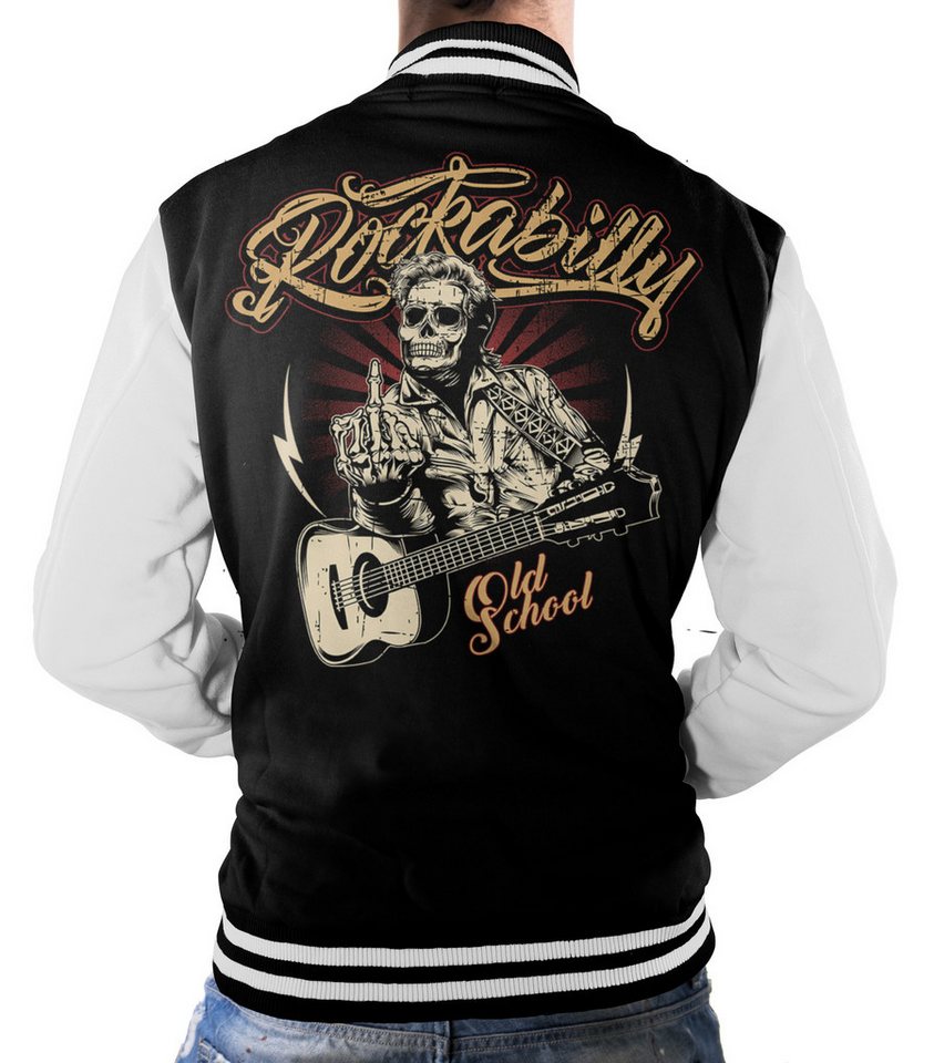 GASOLINE BANDIT® Rockabilly Baseball College Jacke: Old School Coole Rockabilly College Baseball Jacke, schwarz mit weißen Ärmeln.