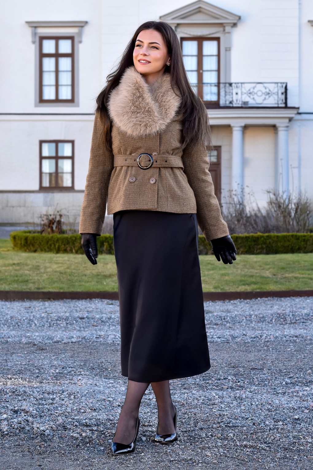 Das Leben ist kurz. Also greif gleich zu und schnapp dir diese wunderbare Jacke! Das langärmelige Modell mit doppelter Knopfleiste besticht durch einen eleganten Reverskragen mit abnehmbarem Kunstfellaufsatz. Die vollständig gefütterte Jacke ist aus einem festen, karierten Wollmischgewebe (nicht elastisch) in Braun gefertigt. * Leicht tailliert * Abnehmbarer Kunstpelzkragen in Beige * Lange Ärmel * Abnehmbarer Gürtel für eine besonders betonte Taille * Doppelte Knopfleiste * Mit Taschen! * Mit satinartigem Stoff gefüttert * Exklusiv bei Topvintage erhältlich