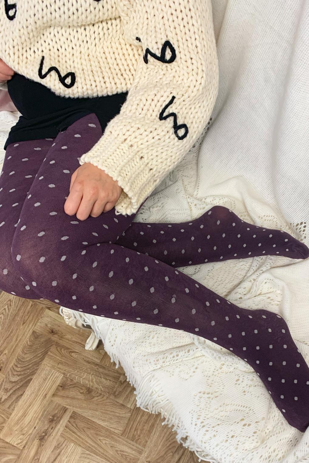 „Warm, fun and fashionable!“ Diese gestrickte Strumpfhose in Pflaume Lila mit Punkten in Off White ist dein neuer Komplize! Der hochwertige, atmungsaktive Bambusmix hält dich an kälteren Tagen herrlich warm. * One size * Gestrickt * Atmungsaktive Fasern (Bambus), die an kälteren Tagen Wärme bieten * Baumwollzwickel * Nicht transparent