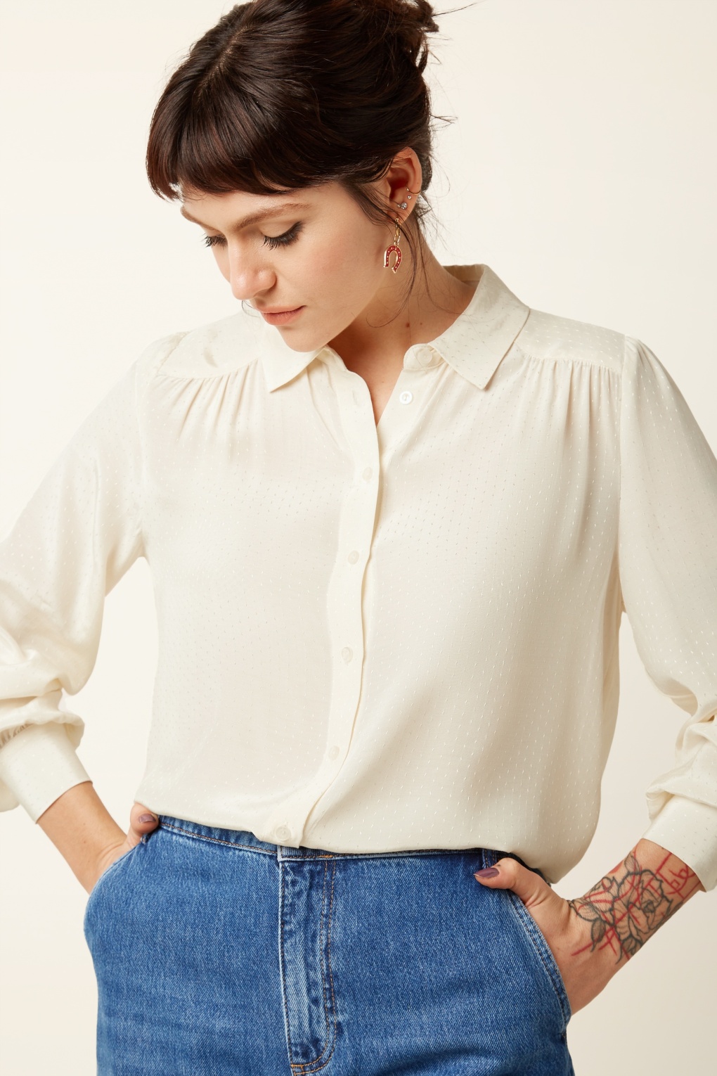 „Crisp. Classic. Can’t go wrong!“ Ein Klassiker, den jede Vintage-Loving-Lady in ihrer Garderobe haben sollte! Diese Bluse hat einen spitzen Kragen, lange Ärmel mit Manschetten und trägt sich herrlich luftig, denn sie wurde aus einem geschmeidigen EcoVero Viskosemix in Elfenbein gefertigt . * Spitzer Kragen * Lange Ärmel mit Manschetten * Knopfreihe * Lang genug, um mit einer normalen Hose kombiniert zu werden