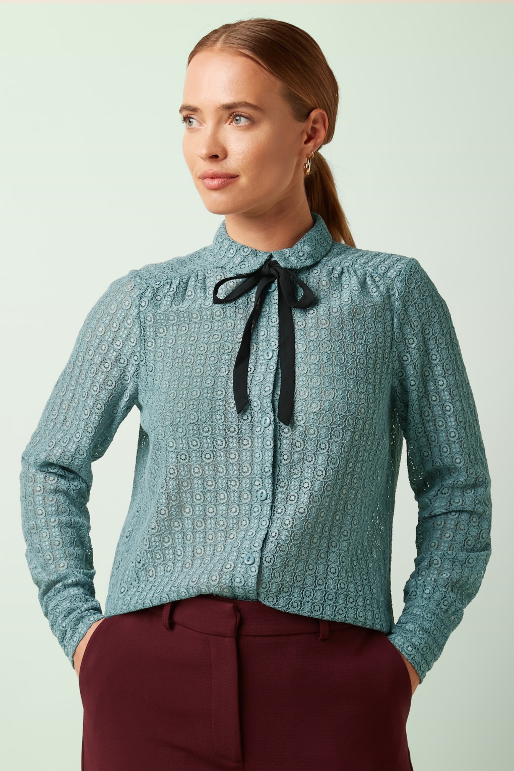 “When in doubt, wear lace!“ Diese wunderschöne, mit einem zarten Lochmuster versehene Spitzenbluse wurde aus einem kaum dehnbaren Baumwollmix in Silberblau gefertigt und mit einem abnehmbaren schwarzen Bindedetail am Kragen versehen. * Knopfreihe * Spitzer Kragen * Abnehmbares Binde-Detail * Lange Ärmel mit Manschetten * Lang genug, um mit einer normalen Hose kombiniert zu werden