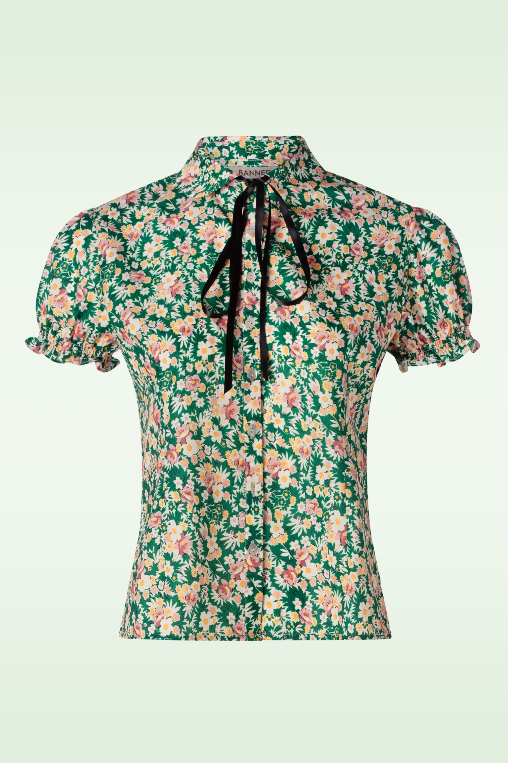 Mauerblume oder Wildblume?;-) Dieses Schätzchen in Grün wurde aus einem glatten und angenehmen, leicht dehnbaren Stoff gefertigt, der, mit Blümchen gemustert, sich herrlich trägt. * Knopfreihe * Abgerundeter Kragen mit fester, schwarzen Schleife * Kurze Puffärmel mit elastischen Ärmeln * Lang genug, um mit einer normalen Hose kombiniert zu werden