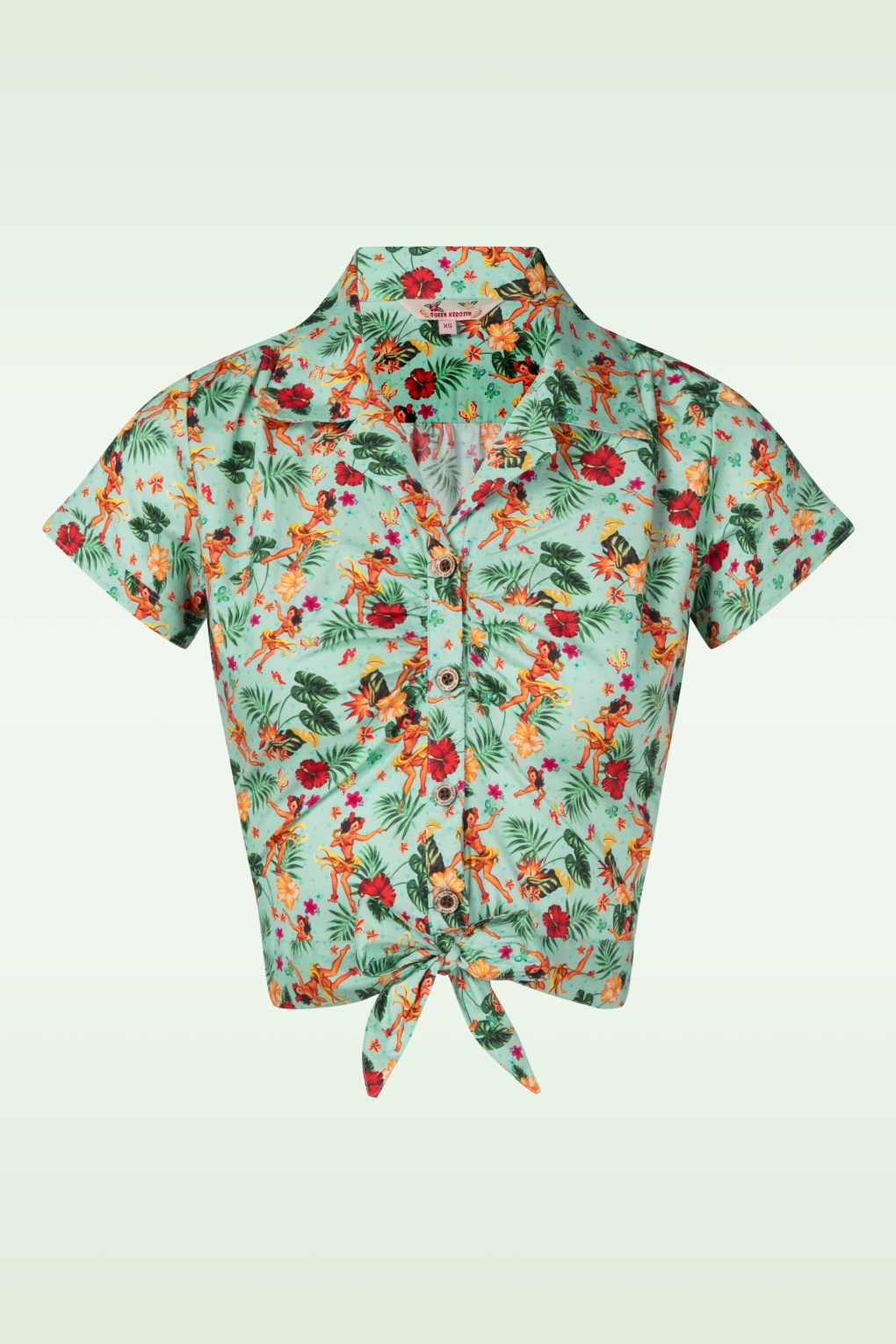 Urlaubsmodus an! – Dieses etwas kürzere Modell passt perfekt zu einer hochtaillierten Hose oder einem hochtaillierten Rock und zeigt den schönsten Teil deines Bauches, wow ;-). Gefertigt aus einem festen, aber leicht dehnbaren, luftigen Baumwollmix in Helltürkis mit einem tropischen Retromuster. * Etwas kürzeres Modell * Verspielter kurzer Kragen * Kurze Ärmel * Knopfreihe * Feste Bindebänder