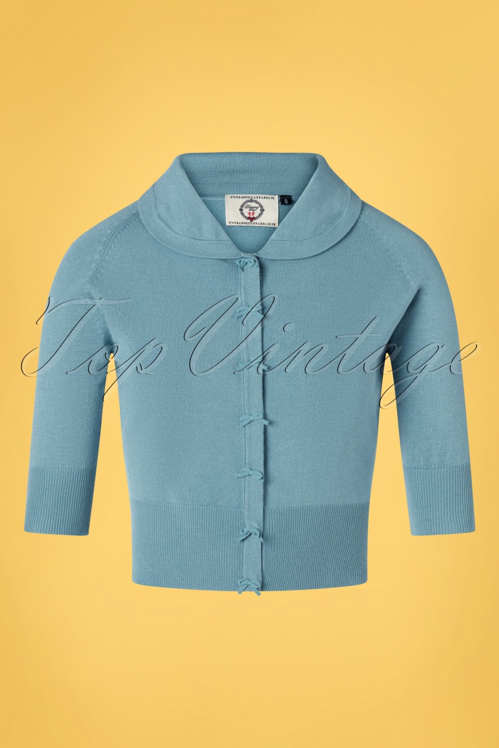 Dieser niedliche 40s April Bow Cardigan in Baby Blue ist einfach entzückend! Denn Schleifen wirken immer niedlich und verspielt! Ein klassischer Cardigan mit eleganten Ärmeln bis zum Ellbogen, einen verspielten Bubikragen und süßen Schleifen. Aus einer weichen und dehnbaren Viskosemischung in Pastellblau in Feinstrick die herrlich trageleicht ist. Unendlich verwandelbar! * Kürzeres Modell * 1/2 Ärmel * Knopfleiste mit verdeckten Druckknöpfchen * Feste Schleifen * Elastische Rippborten