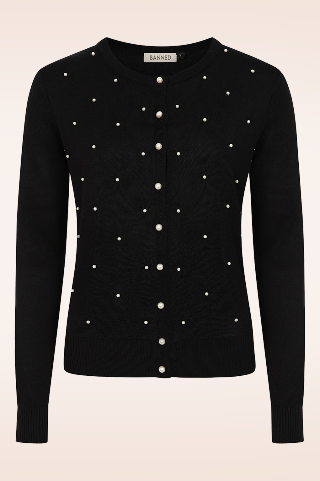 Ein echter Klassiker in Schwarz, bestückt mit eleganten Perlen! Dieses Modell aus einem fein gestrickten, elastischen Viskosemischgewebe ist wunderbar angenehm zu tragen und besticht durch die ansprechende Verzierung mit Kunstperlen. * Lange Ärmel * Knopfleiste mit (größeren) Kunstperlen * Elastische Rippbündchen * Passend für Hosen mit normaler Leibhöhe