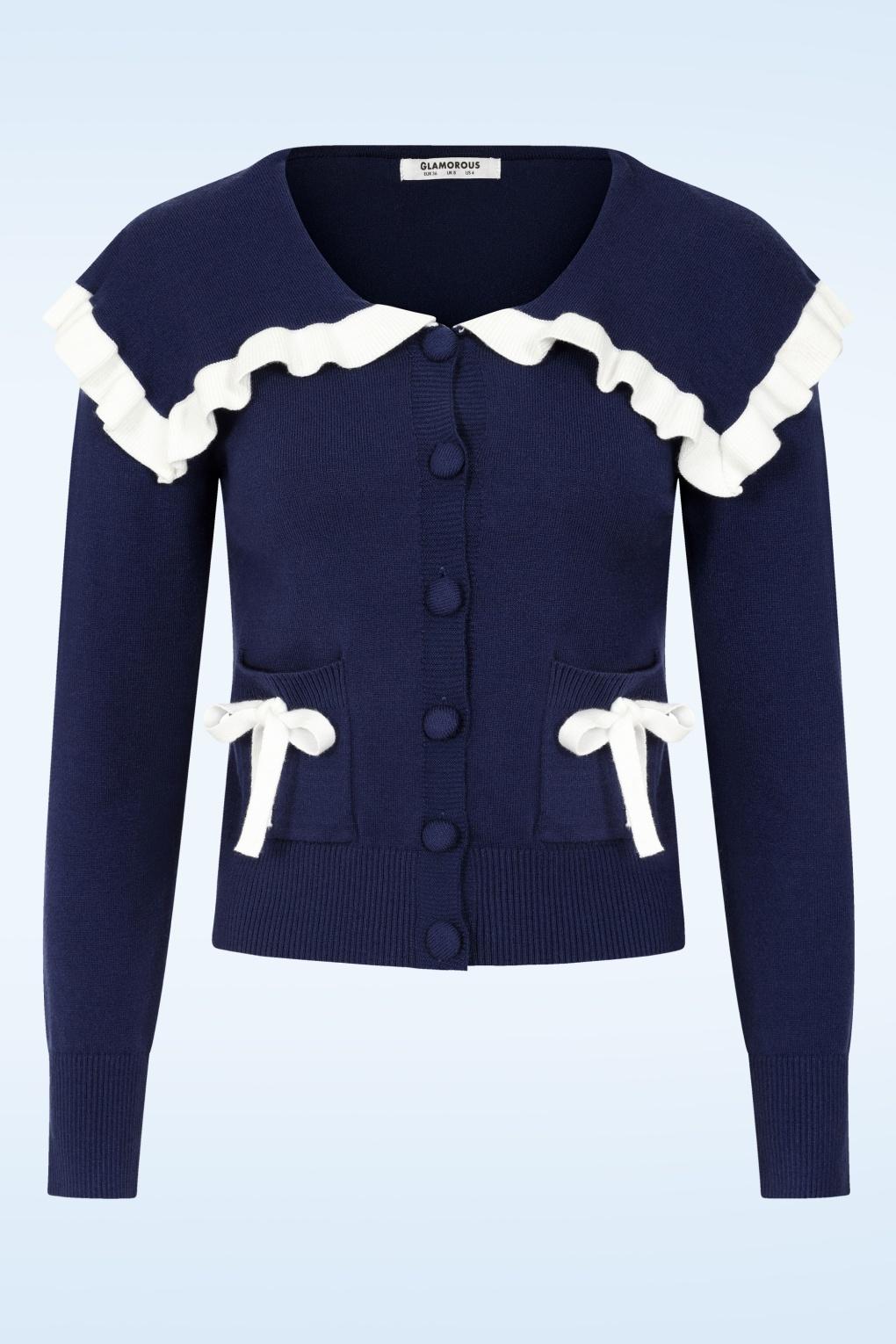 Kleine Details, große Wirkung! Dieser Cardigan mit Knopfleiste besticht durch seinen auffälligen Kragen mit gerüschtem weißem Rand und die weißen Zierschleifen an den Taschen. Das Modell in Marineblau ist aus einem fein gestrickten, weichen und dehnbaren Viskosemischgewebe gefertigt, das herrlich angenehm zu tragen ist. * Übergroßer Kragen * Lange Ärmel * Taschen mit Zierschleifen * Knopfleiste * Elastische Rippbündchen * Passend für Hosen und Röcke mit normaler Leibhöhe