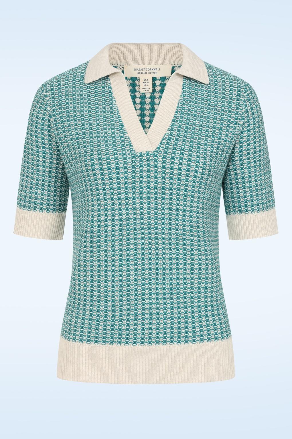 Ein Strickoberteil aus Bio-Baumwolle im Polo-Style: Dieses kurzärmelige Modell im Stil eines Polo-Shirts hat einen V-Ausschnitt mit Spitzkragen und ist aus weicher, dehnbarer Bio-Baumwolle in Creme- und Blautönen gefertigt, die herrlich angenehm zu tragen ist. Ein absolutes Must-have! * Kurze Ärmel * V-Ausschnitt mit Spitzkragen * Elastische Rippbündchen * Passend für Hosen mit normaler Leibhöhe