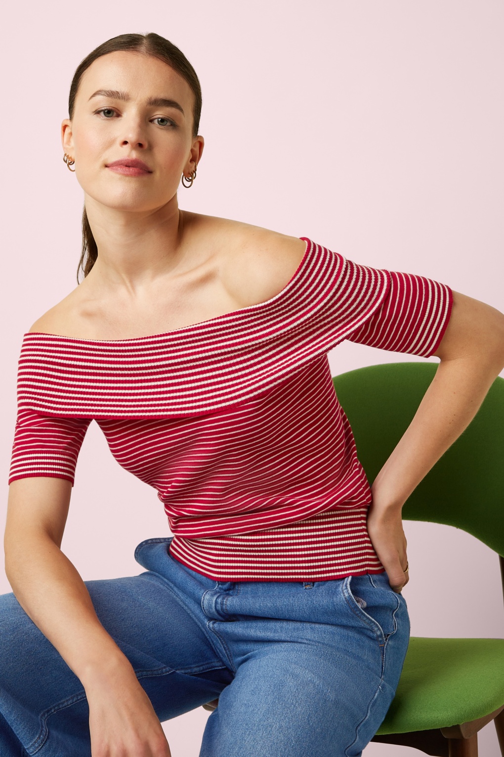 Jede Frau braucht einen Kleiderschrank voller gestreifter Shirts! Dieses tolle Oberteil ist ein absolutes Must-have für die kommende Saison. Ab damit in den Warenkorb! Das Modell aus fein gestrickter, geschmeidiger Bio-Baumwolle hat einen eleganten Bardot-Ausschnitt und fröhliche Streifen in Chilirot und Weiß. * Schulterfrei * Kurze Ärmel * Passend für Hosen mit normaler Leibhöhe