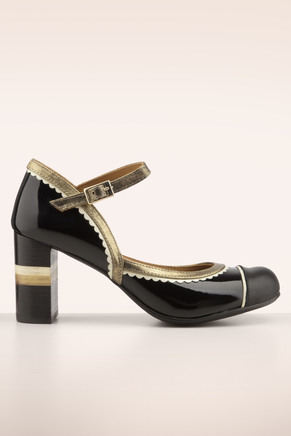 Ein Blick auf diese Pumps und du freust dich spontan auf den Herbst 😉 Gefertigt aus einer Kombination aus schwarzem Leder und Lackleder mit auffälligen (gewellten) Paspeln in Bronze und Elfenbein. Der auffällige Blockabsatz in Holzoptik mit Streifen vollendet das Bild. Mit dem Fußbett aus weichem Foam läuft es sich wie auf Wolken. Mehr Retro geht nicht! 😉 * Mary Jane Style * Verstellbarer Knöchelriemen * Echtes Leder/Lackleder * Runde Schuhspitze * Stabiler Blockabstz * Bequeme Fußbett aus Leder * Anti-Rutsch Sohle * Diese Farbkombination wurde für Topvintage entworfen