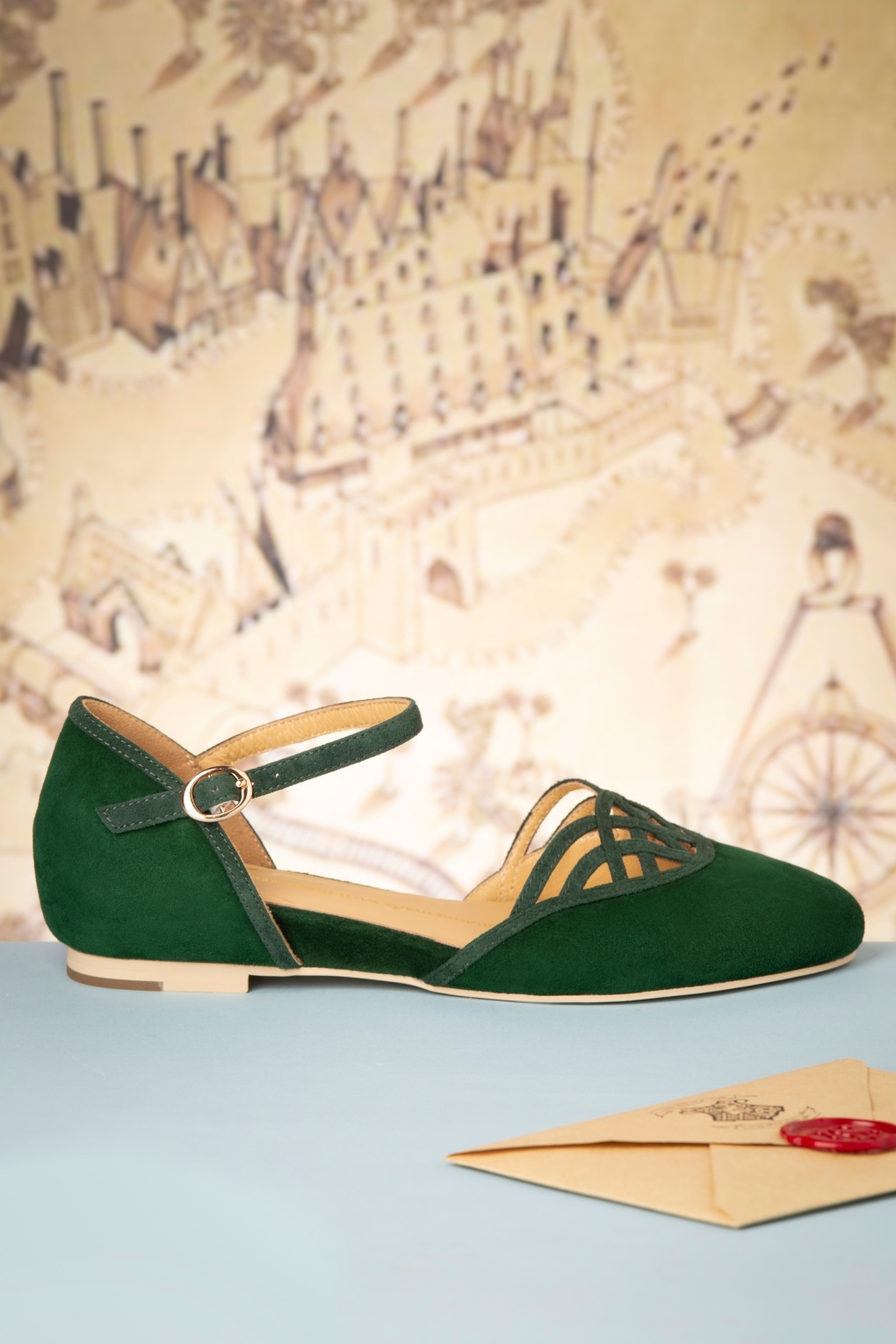 Diese 50s Serpente Flats in Emerald Green aus der ‚Porto‘ Kollektion sind ernannt nach der Stadt die von der Art Nouveau Architektur bezaubert wurde und die die bekannte Geschichte über junge Magier inspiriert hat. Diese flache Schuhen sind eine Ode an das etwas düstere Reis Filhos Gebäude. Hergestellt aus smaragdgrünem Wildleder von einer wunderbaren Qualität und versehen mit zierlichen Ausschnitte am Rist, ein verstellbares Knöchelriemchen und einen niedrigen Absatz. Wir brauchen keine schwarze Magie um dich zu überzeugen… diese Schätzchen liegen bestimmmt schon in deinem Warenkorb! 😉 * Wildleder * Mandelförmige Schuhspitze * Verstellbares Knöchelriemchen * Goldfarbene Schnalle * Erhöhte Ferse (20 mm) * Komfortables Fußbett