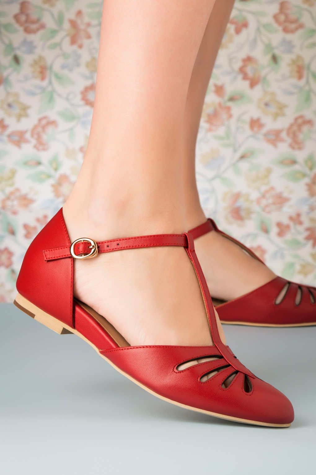 Sie sind ernannt nach einst der meist wohlhabenden Ländern in Südost-Asien. Diese 50s Singapore T-Strap Flats in Red sind hergestellt aus tiefrotem Leder von einer wunderbaren Qualität und versehen mit einem verspielten T-Riemchen, zierlichen Ausschnitten und einem niedrigen Absatz. In diesen Schätzchen wirst du den Frühling auf stilvolle Weise begrüßen können! * Leder * Mandelförmige Schuhspitze * T-Riemchen * Verstellbares Knöchelriemchen mit praktischem Hakenverschluss * Goldfarbene Schnalle * Erhöhte Ferse (20 mm) * Komfortables Fußbett