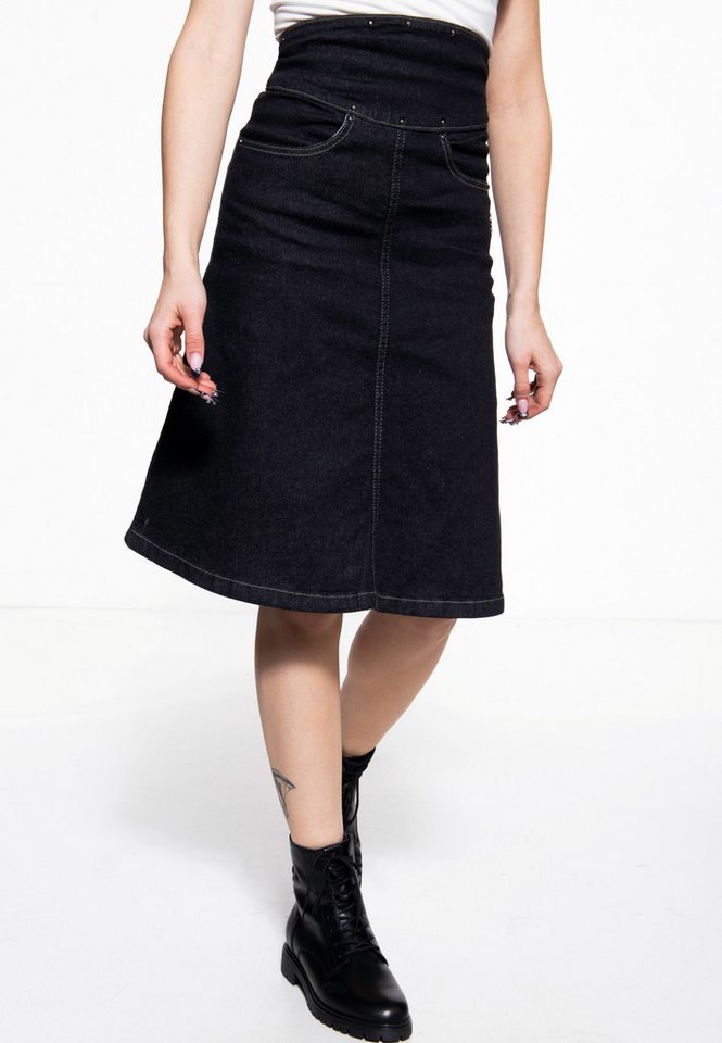 Der Denim A-Linien-Rock von Queen Kerosin verleiht deinem Look eine rockige Note und sorgt für authentischen Style. Sein ausgestellter Schnitt in Kombination mit dem breiten, vorne höher geschnittenen Bund zaubert eine coole Silhouette. Dezente Nieten, Gesäßtaschen und ein kleines metallenes Logo-Emblem an der Seite sorgen für liebevolle Details. Eine Metallschnalle am Rücken erlaubt es, die Weite individuell anzupassen. Der seitliche Reißverschluss mit Hakenverschluss macht das Anziehen unkompliziert, während die elastische Baumwollmischung Bewegungsfreiheit und Tragekomfort bietet.Model Größe: Unser Model ist 168 cm und trägt Gr. XS