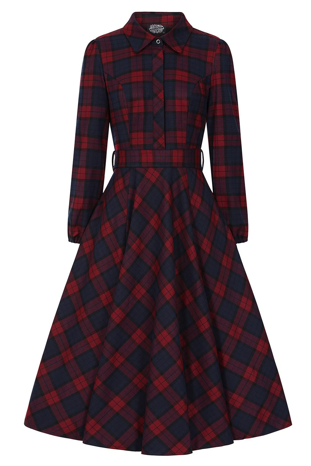 kariertes Muster in rot und dunkelblau|versteckter Reißverschluss|Fit-n-Flare Schnitt|Gürtelschlaufen mit passendem Gürtel|zwei Eingriffstaschen am Seitensaum