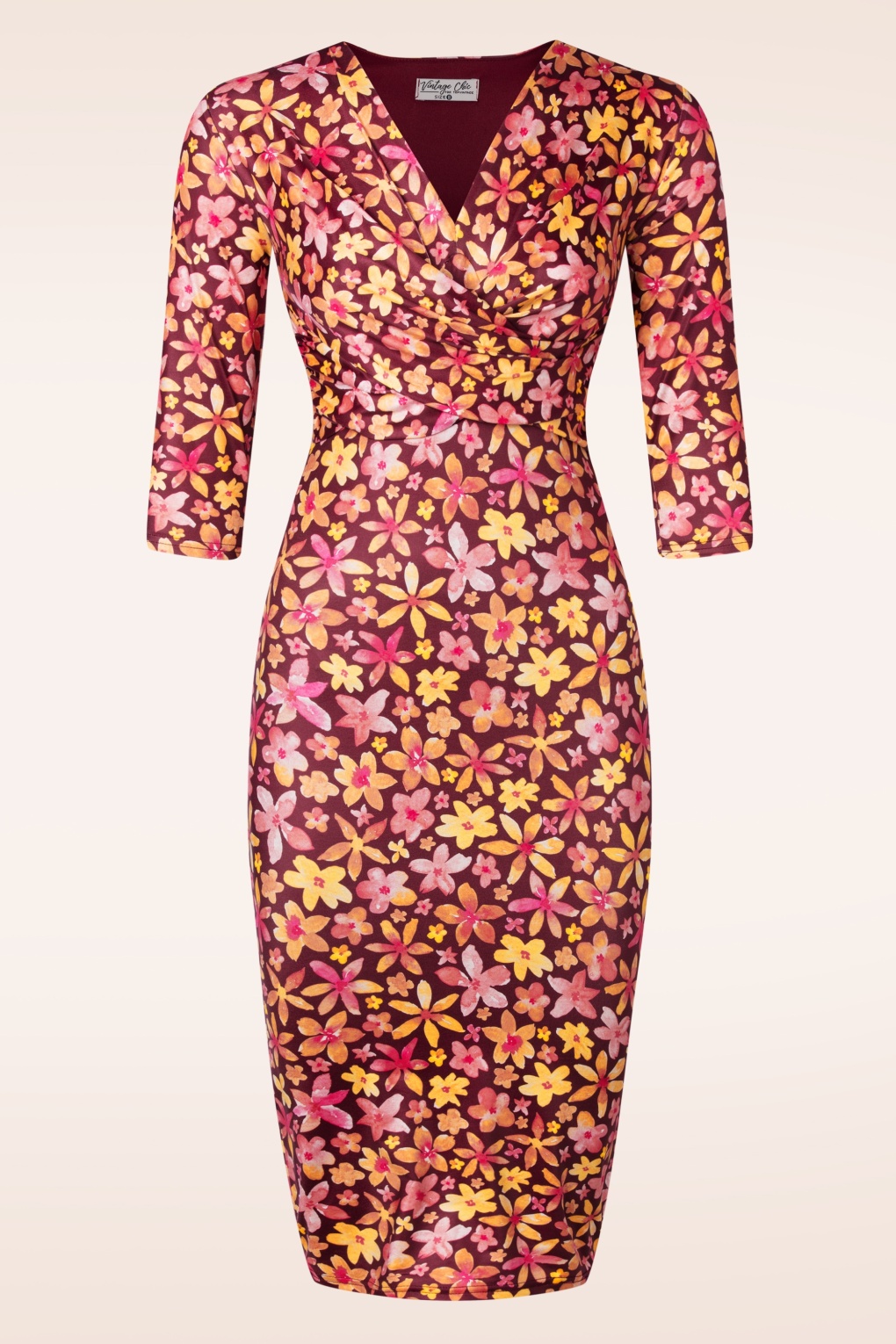 “Life is better in Eliza!“ Dieses sommerliche und kurvenumspielende Kleid zeigt sich mit einem V-Ausschnitt, einer fest plissierten Wickelopitk bei der Brust und wurde aus einem dehnbaren Slinky Stoff in glänzendem Weinrot mit einem fröhlichen Blumenmuster in Gelb und Rosatönen gefertigt. * Pencil * V-Ausschnitt * Fest plissiertes Wickel-Detail * 3/4 Ärmel * Komplett gefüttert * Kein Reißverschluss oder Knopf; anziehen & ‚ready to go‘! * Fällt bei einer Größe von 1,70 m etwas über das Knie