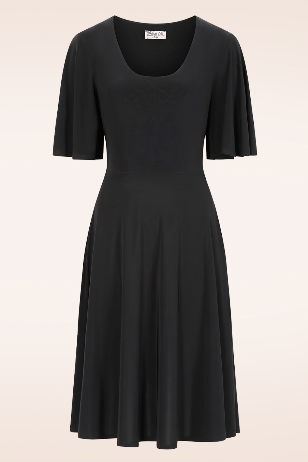 Hier trifft Eleganz auf lässigen Komfort: Dieses Kleid besticht durch ein figurbetontes Oberteil mit kurzen, weich fließenden Schmetterlingsärmeln und einem tiefen Rundhalsausschnitt. Das Modell in Schwarz ist aus einem anschmiegsamen, elastischen und glatten Stoff gefertigt, der kaum knittert. * Rundhalsausschnitt * Gefüttertes Oberteil * Kurze Schmetterlingsärmel * Semi-Swing-Modell * Abnehmbarer Bindegürtel * Kein Reißverschluss, keine Knöpfe * Endet bei einer Körpergröße von 1,70 m unterhalb des Knies * Exklusiv bei Topvintage erhältlich