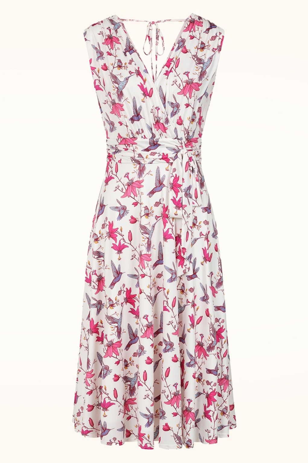 Leicht wie eine kühle Brise, strahlend wie der Sommer: Wenn du das Swingkleid Jane zum ersten Mal anziehst, wirst du sofort feststellen, dass es einfach perfekt in deine Sommergarderobe passt! Das Modell in Weiß ist aus einem anschmiegsamen, elastischen und glatten Stoff gefertigt, der leicht glänzt, nicht knittert, herrlich angenehm zu tragen ist und durch ein farbenfrohes Muster mit Blumen und Kolibris in Rosa und Blau besticht. * Fließender Schnitt * Vollständig gefüttert * Fest vernähte Schleifenbänder * Kein Reißverschluss, keine Knöpfe: einfach reinschlüpfen und los geht’s! * Endet bei einer Körpergröße von 1,70 m auf halber Wadenhöhe