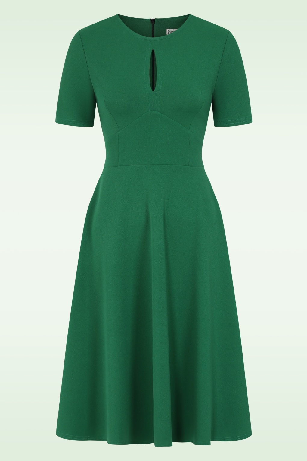 Ein smaragdgrüner Hingucker für unvergessliche Momente: Das kurzärmelige Swingkleid Solange hat einen hohen Rundhalsausschnitt mit dezentem Schlüsselloch-Detail und einen fließenden Rock, der eine klassische Silhouette zaubert. Das Modell ist aus einem festen, aber dennoch geschmeidigen und elastischen, crêpe-ähnlichen Stoff in Smaragdgrün gefertigt. * Semi-Swing-Modell * Hoher Rundhalsausschnitt * Kurze Ärmel * Verdeckter Reißverschluss hinten * Endet bei einer Körpergröße von 1,70 m knapp unterhalb des Knies * Exklusiv bei Topvintage erhältlich