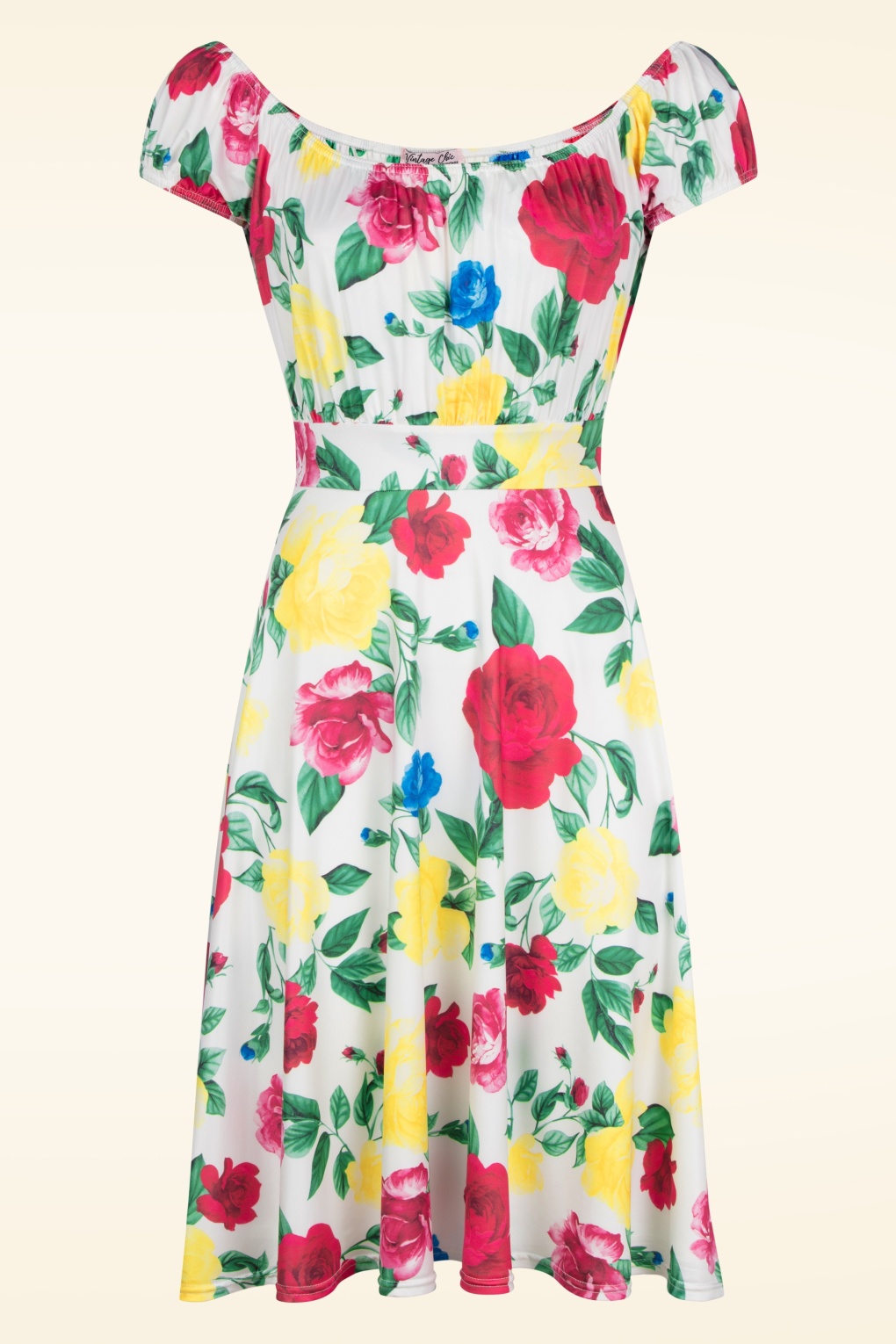 Vintage Charme in voller Blüte! – Die wunderschöne Elena darf in der Garderobe einer vintage-liebenden Lady nicht fehlen! Das Oberteil mit plissiertem Brustbereich, die kurzen Ärmel mit Gummizug, die auch ‚off shoulder‘ getragen werden können und der flowy Swing Rock, der sich ab der Taille entfaltet, sorgen für eine wunderschöne Silhouette. Gefertigt aus einem glatten und angenehmen, leicht glänzenden und dehnbaren Stoff in Weiß, der ein Muster farbenfroher Rosen zeigt – garantiert knitterfrei und tragefein & daher auch eine ideale Reisebegleiterin! 😉 * Swing Modell * Komplett gefüttert * Ärmel, die schulterfrei getragen werden können * Kein Reißverschluss oder Knopf; anziehen & ‚ready to go‘! * Fällt bei einer Größe von 1,70 m etwas über das Knie