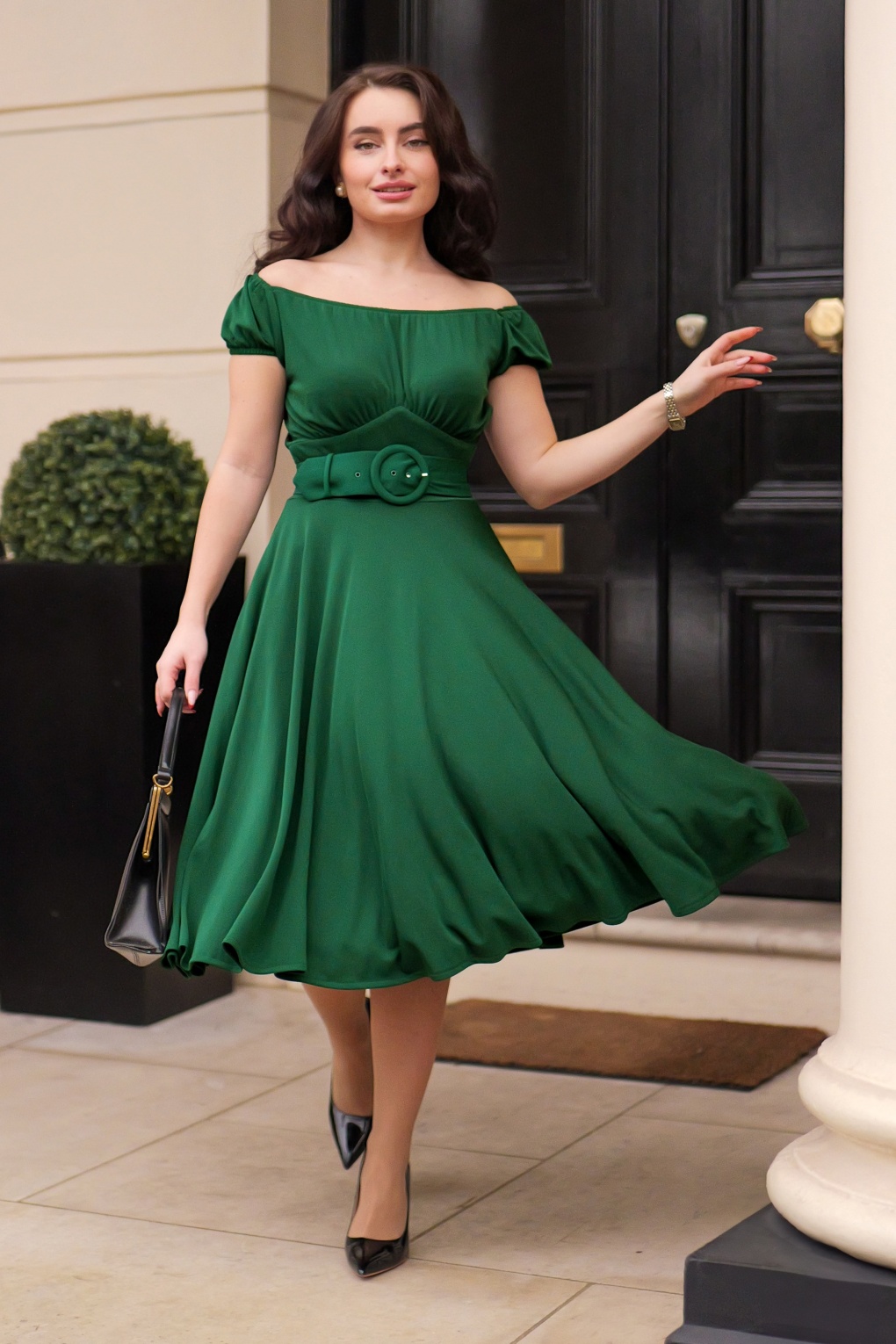 “Steal the show, wherever you go!“ Diese Saison haben sich unsere Inhouse-Designer*innen von dem Dokumentarfilm: Die wilde Welt der Jayne Mansfield, inspirieren lassen, der über die Reisen der Schauspielerin Jayne Mansfield berichtet! Dieses verführerische Swingkleid zeigt ein Top im Carmen Stil und wurde aus einem angenehmen und dehnbaren, dunkelgrünen Stoff gefertigt. Die Bengaline-Shapewear sorgt für ein herrliches Tragegefühl und eine perfekte Passform und beginnt unterhalb der Brust. * Semi-Swing Modell * Gefüttertes Top im Carmen Stil * Elastische kurze Ärmel, die auch off-shoulder getragen werden können * Mit Taschen! * Abnehmbarer Bindegürtel für eine besonders tolle Taille * Korrigierende Bengaline-Shapewear; reicht von unterhalb der Brust bis über die Hüfte * Verdeckter Reißverschluss an der Seite * Die hübsche Brünette Lira Karina misst 1,56 m; ihre Pumps und Accessoires gehören ihr * Das hübsche Model Sam Elson (blossomandbuttercups) misst 1,70 m: ihre Pumps und Accessoires sind ihr Eigentum