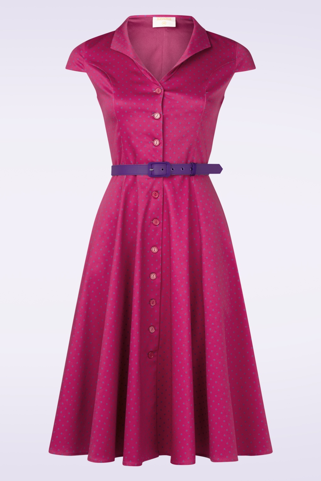 „Bordeaux dreams and polkadot schemes!“ Dieses Angie Polka Dot Swingkleid ist exklusiv bei Topvintage erhältlich und wurde mit viel Liebe von unseren Inhouse-Designer*innen entworfen! Das enganliegende Oberteil zeigt einen wunderschönen V-Ausschnitt mit einem feinen Kragen, Cap-Ärmel und ab der Taille entfaltet es sich in einen schönen Swingrock, der eine feminine Silhouette verleiht. Die spielerische Knopfreihe über die gesamte Länge und der passende lila Gürtel sorgen für die letzten i-Tüpfelchen. Gefertigt aus einem festen, aber angenehmen, leicht dehnbaren Baumwollmix in Bordeauxrot, der all-over mit lila Polka Dots übersät wurde. “There’s no such thing as rocking too many polkadots!“ * Full Swing Modell * Gefüttertes Top * V-Ausschnitt * Feiner Kragen * Cap-Ärmel * Knopfreihe vorne * Seitentaschen * Abnehmbarer Gürtel * Kombinier mit einem unserer Petticoats für einen besonders festlichen Effekt * Kein Reißverschluss * Fällt bei einer Größe von 1,70 m über das Knie * Melissa ist 1.78m groß * Exklusiv bei Topvintage erhältlich * Bitte beachte: Die Farbe der Hose im Video kann von der tatsächlichen Farbe der Hose abweichen.