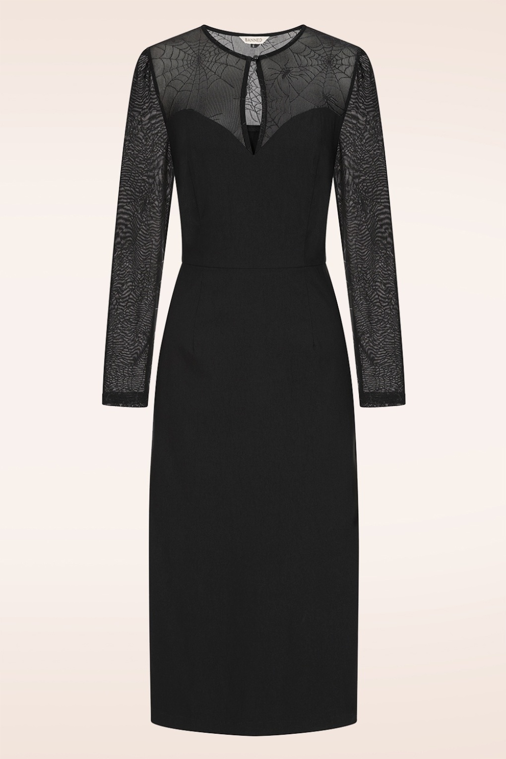 Spinne dein Netz der Verführung! Dieses schwarze Kleid mit taillierter Silhouette besticht durch seinen Herzausschnitt und die langen Ärmel aus Mesh-Gewebe mit Spinnennetz-Muster. Es ist aus einem robusten, elastischen Bengalin-ähnlichen Stoff gefertigt, der für eine schöne Passform sorgt und herrlich angenehm zu tragen ist. * Bleistiftkleid * Herzausschnitt mit Schlüsselloch-Detail * Lange Ärmel aus Mesh-Gewebe * Verdeckter Reißverschluss mit Haken hinten * Schlitz hinten * Endet bei einer Körpergröße von 1,70 m knapp unterhalb des Knies
