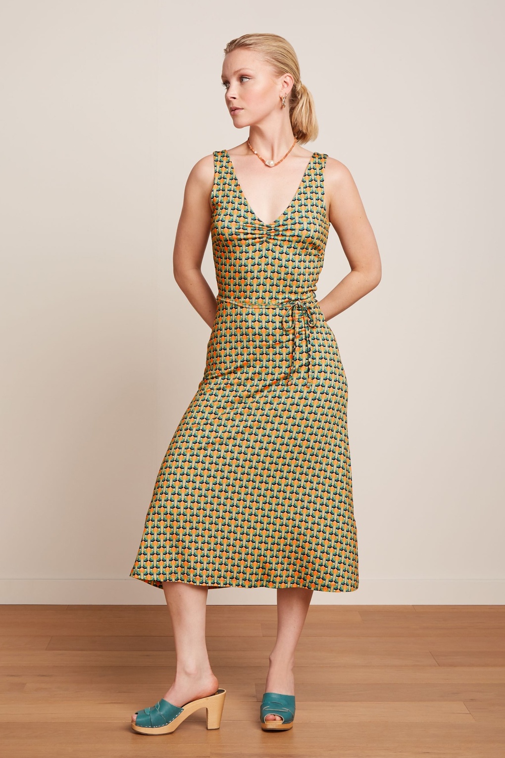 Wenn du noch keine Sommergefühle hast, dann wird dieses flowy Kleid schon dafür sorgen! Anna akzentuiert deine Taille mit dem schmalen, abnehmbaren Stoffgürtel und wurde aus einem angenehmen und dehnbaren EcoVero Viskosemix mit einem grafischen Muster in Lachsorange, Grüntönen, Marineblau und einem Hauch Weiß gefertigt. * Gefüttertes Top * Ärmellos * Plissierter V-Ausschnitt * V-Rücken * Abnehmbarer Bindegürtel aus Stoff * Kein Reißverschluss oder Knopf * Fällt bei einer Größe von 1,70 m über das Knie