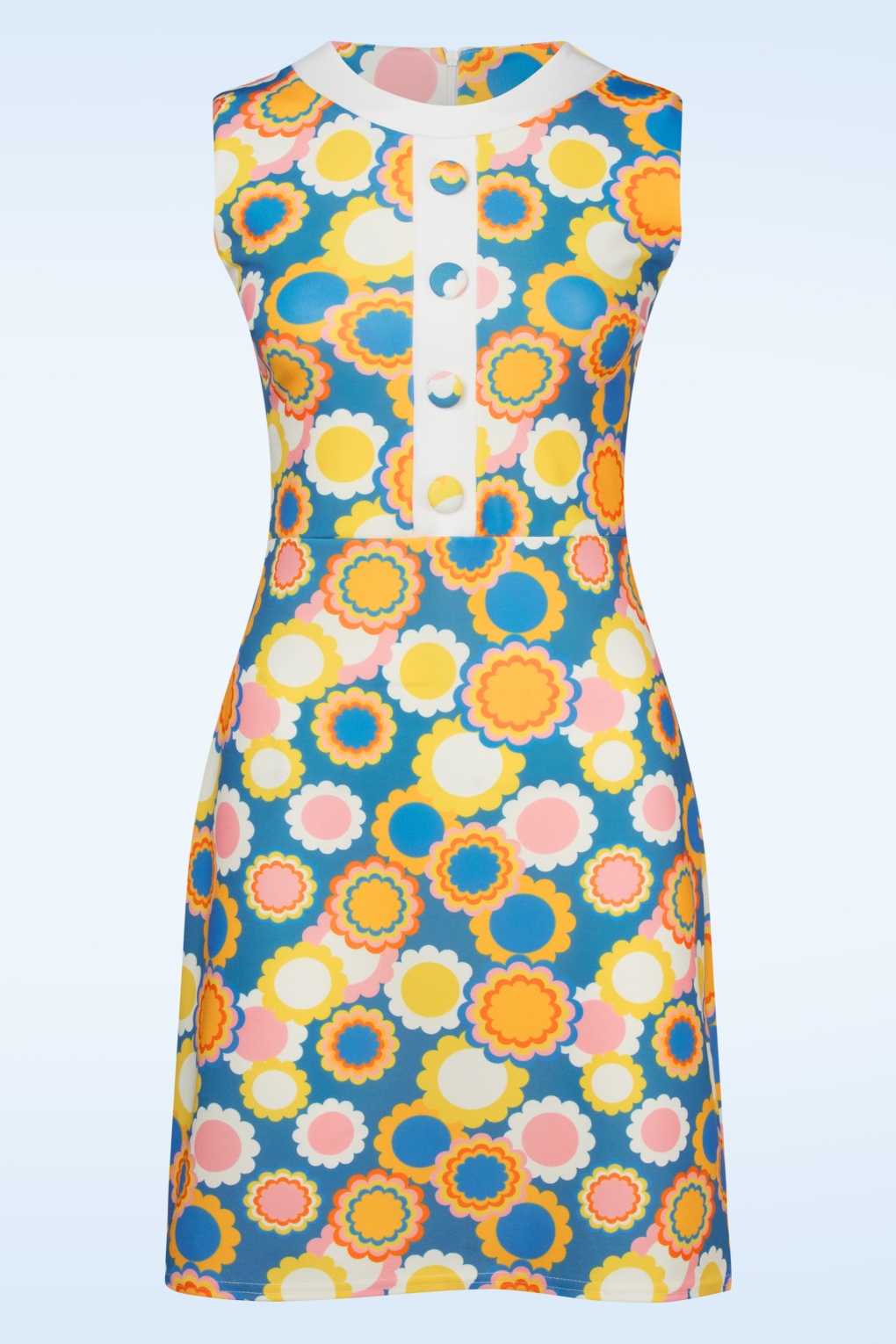 “Time to move and groove!!“ Daisy hat eine hohe Halslinie, eine Reihe an Zierknöpfen und wurde aus einem dehnbaren und crepeartigen Stoff in Blau gefertigt und mit farbenfrohen Retro-Blumen gemustert. * A-Linien Modell * Gefüttertes Top * Dekorative Knöpfe * Verdeckter Reißverschluss hinten * Endet bei einer Größe von 1.70 m oberhalb des Knies