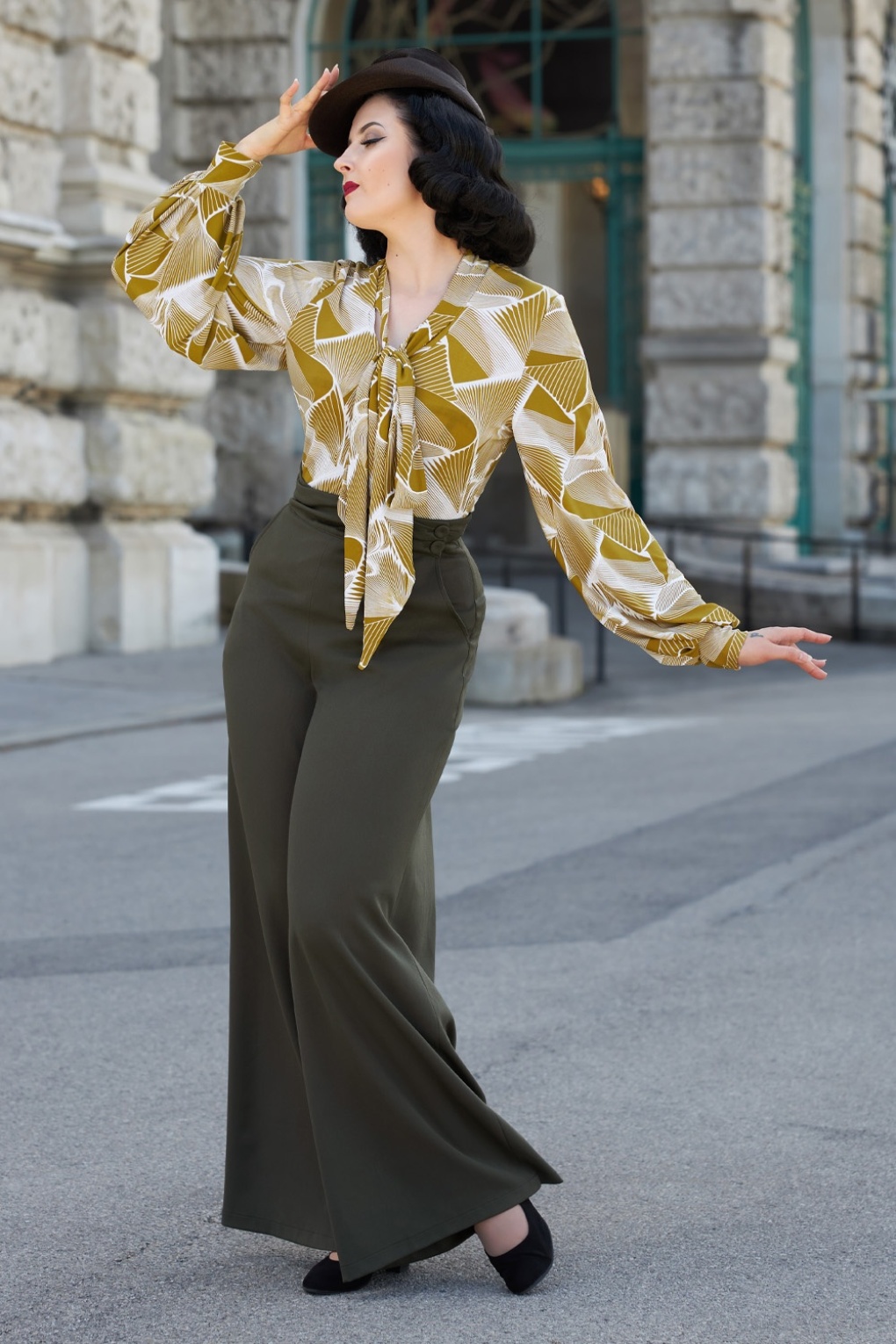 Setze ein Statement, wo immer du auch bist & trage diese vielseitige Hose, die zu der neuen Kollektion der Marke Miss Candyfloss gehört: “Vintage Glam Icons“. Die Kollektion hat sich von den glamourösen ersten Supermodels inspirieren lassen! Haidee Juniper wurde aus einem festen, aber angenehmen Stoffmix in Olivgrün mit einem Hauch Viskose gefertigt – leicht dehnbar für ein komfortables Tragekomfort. * High Waist Modell * Seitentaschen * Paspeltaschen hinten * Knopfverschluss an der Seite * Verdeckter Reißverschluss * Gerades, weites Hosenbein
