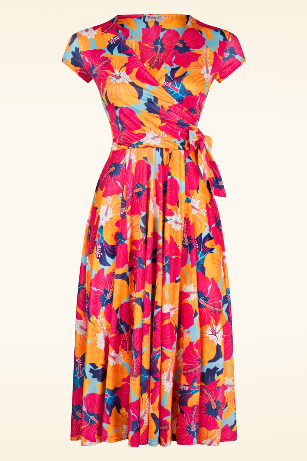 Dieses florale Layla Wickelkleid ist eine wahre Vintage-Schönheit und eignet sich für jeden Anlass! Das figurnahe Oberteil zeigt einen wunderschönen V-Ausschnitt, eine schöne Wickeloptik, spielerische Bindebänder, die du sowohl lose als auch gebunden tragen kannst und es wurde an der Seite schmeichelhaft plissiert. Ab der Taille entfaltete es sich in einen flotten Semi-Swing Rock. Gefertigt aus einem glatten und geschmeidigen, leicht glänzenden, dehnbaren Stoff, der mit prächtigen bunten Blumen gemustert und für den Extra-Komfort komplett gefüttert wurde. „Layla we’re in love!“ * Semi-Swing Style * Gefüttertes Top * Festes Wickeltop * Kurze CAP-Ärmel * Feste Bindebänder * Kein Reißverschluss oder Knopf; anziehen & ‚ready to go‘ * Fällt bei einer Größe von 1,70 m über das Knie