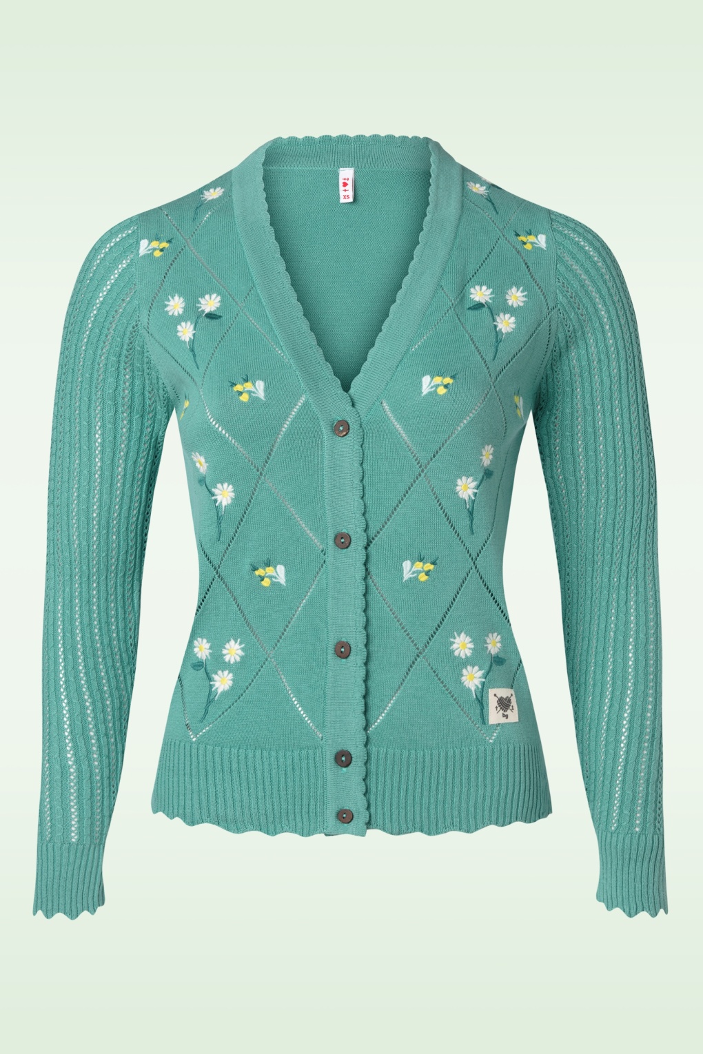 Diese herzallerliebste Strickjacke hübscht jedes Outfit auf! Gefertigt aus einem weichen, feingestrickten Bio-Baumwollmix in Türkis, vollendet mit einem gewellten Rippbündchen, einem Lochmuster, gestickten Blümchen und Knöpfen aus dem Holz einer Kokosnuss. Die Kombinationsmöglichkeiten sind unendlich! * Kokosnuss-Knöpfe * Lange Ärmel * Stretchy Rippbündchen * Lang genug, um mit einer normalen Hose kombiniert zu werden