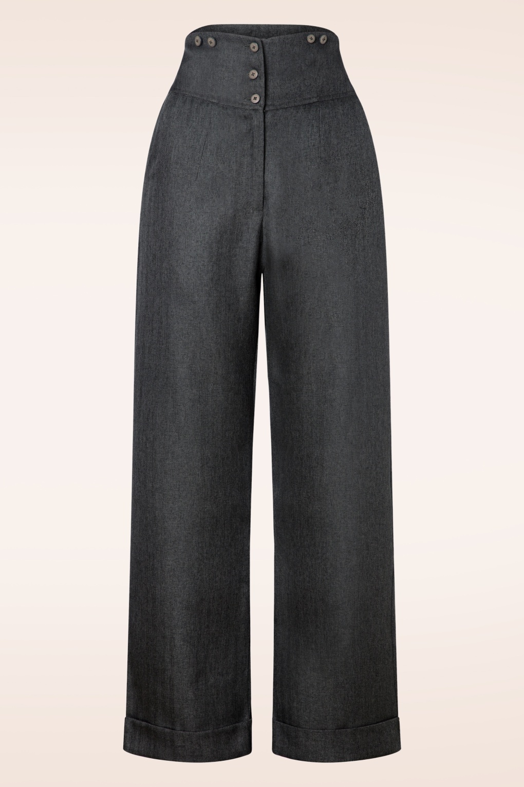 Die 50s Sassy Trousers in Grey ist inspiriert an den Hosen die von den selbstbewussten Damen in die 40er und 50er Jahre getragen wurden! Der feminine, hohe Bund kontrastiert schön zu dem weiten Hosenbein und hat einen tollen schlankwirkenden Effekt, auch bei einer breiteren Hüftweite oder einem kräftigen Po. Dank den Knopf-Details kann diese Hose auch mit Trägern getragen werden und das verleiht diese Schönheit eine verspielte Note. Sie ist hergestellt aus einem geschmeidigen, melierten, grauen Stoff (nicht dehnbar) und mit einem eleganten Aufschlag am Hosenbein versehen. Trage sie mit einer weißen Bluse und einem Paar Pumps für einen perfekten, retro Büro-Look! * Taillenhoch * Kann mit Trägern kombiniert werden * Seitliche Eingriffstaschen * ‚Blinde‘ Paspeltaschen hinten * Reiß- und Knopfverschluss auf der Vorderseite * Weite Hosenbeine mit Aufschlag * Leicht zu kürzen